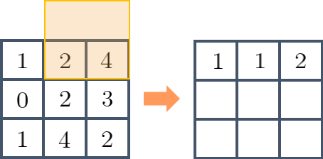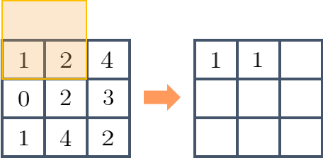 次に局所領域を右にスライドさせると、今度は1と2が局所領域に含まれますので、この局所領域の最小値は1となります。