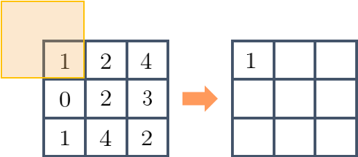 erodeの処理で2×2の局所領域を指定すると、次のような手順で計算がおこなわれていきます。 オレンジ色の枠が注目している局所領域になります。 まず、次のように最初の局所領域に左上のピクセルしか含まれていないので、この局所領域の最小値は1として扱います。