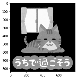 文字の部分をみるとわかりやすいですが、だいぶ小さくなっています。 目の部分はピクセル値が小さいので、ここは逆に膨張しています。