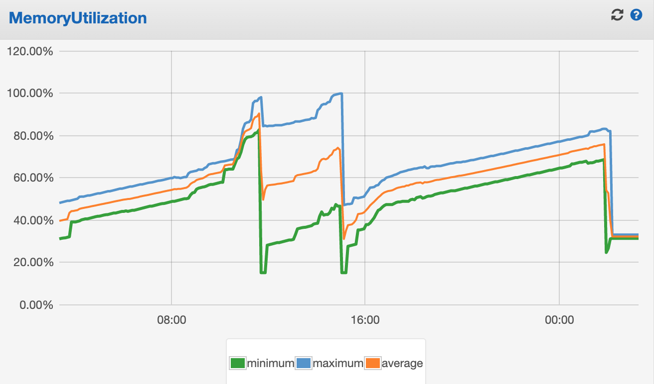 バージョンアップ後のメモリ使用量が以下のグラフの右端の平らな部分です。時間経過でメモリ使用量が増えるようなことがなくなっています。