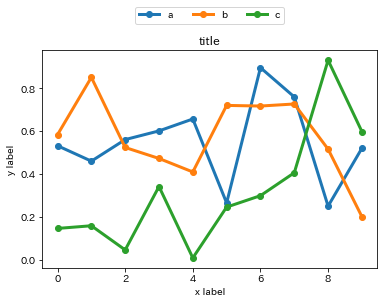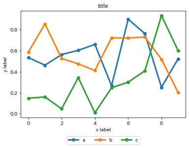 凡例の左右の位置をグラフと揃えて、上に表示するときは以下のようにします。 ncol=3とすることで横一列に3つ分のグラフの凡例を表示できます。