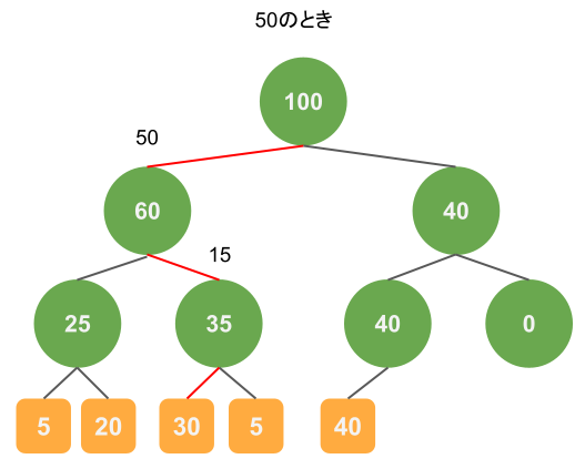 ノードの重みで引いた値が10になるため、次に左側のノードにいき、結果として40の重みをもつデータがサンプリングされています。