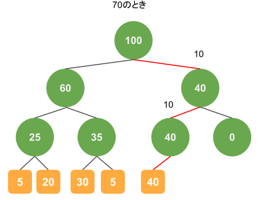 処理をおっていくと、はじめにrootノードが100という重みをもっているので、70を生成したときは右の子ノードに移ります。
