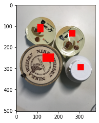 いま、4つの物体が写っていますので、これを4つの領域と背景に分けることを考えます。 マーカーは以下のように指定します。